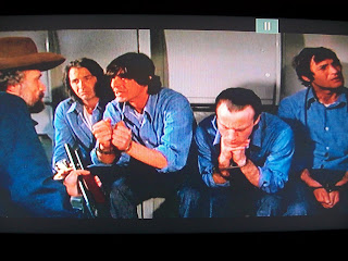 Then, the story veers into a strange angle. A group of nortorious dudes are being shipped to a prison. Crazy Boy and his guido bad dudes. They are being kept in control by an out-of-place Italian cowboy. I guess a remnent of some cancelled spaghetti western.