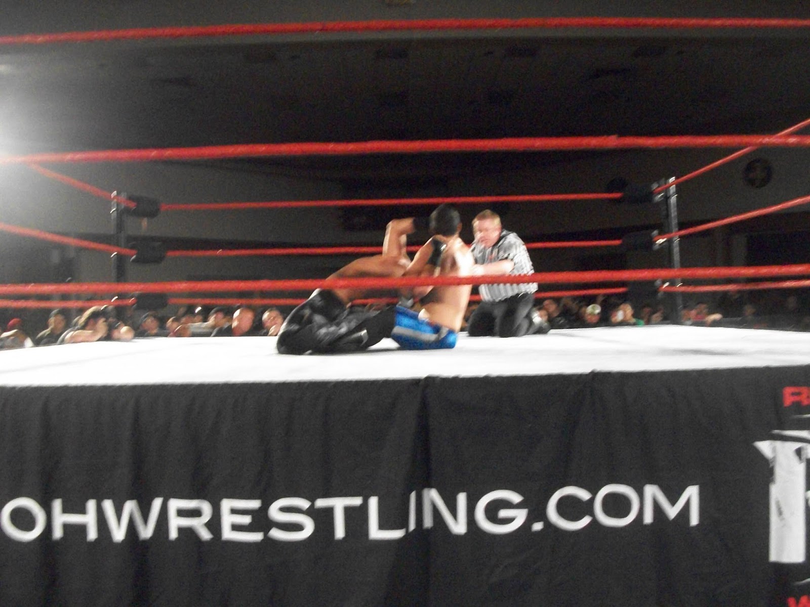 Properly shaved New York douchebag Bobby Fish took on Texas indy standout, Ray Rowe. As you might imagine, it was a physical match that found Rowe chopping Fish until he bled. Rowe blasted Fish with his double knee flying attack and it was amazing.